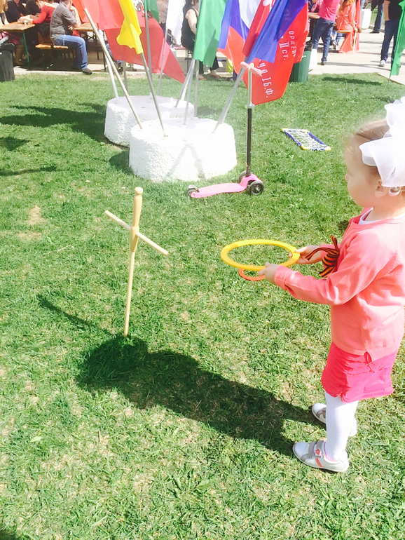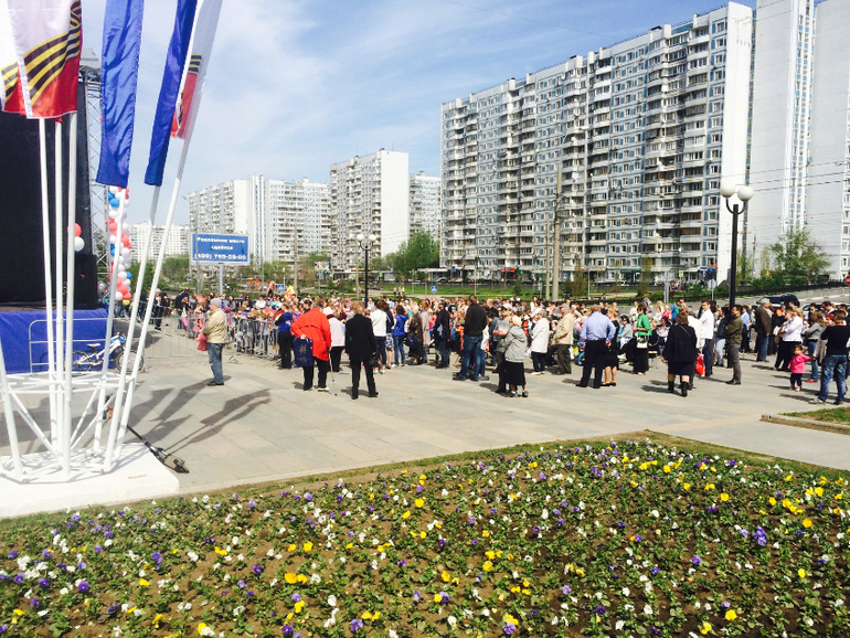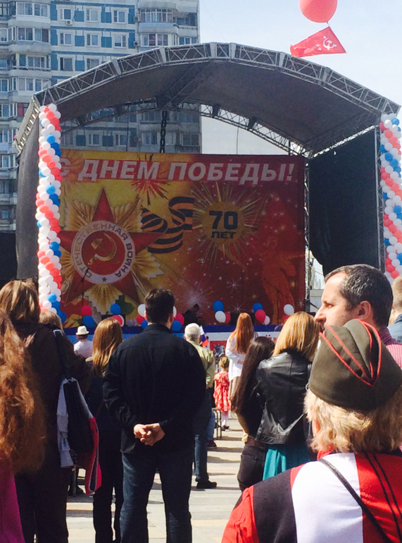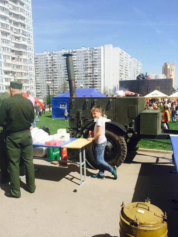 Потом отправились гулять. По традиции - это районная Площадь Защитников Неба. Здесь организуют массовые гуляния, концерт весь день, развлечения, полевая кухня и шашлыки. Ниже фото)
