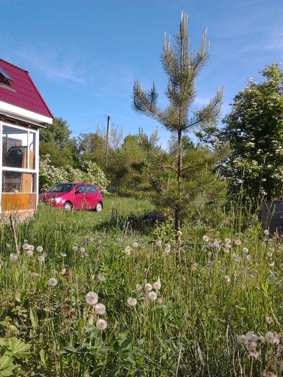 Сосёнка, принесенная из лесного хозяйства, уже серьёзно подросла. Обрезка кончиков веточек ока не даёт результатов... плохо она пышнится... вытягивается. Справа и за машиной - кусты калины радуются ласковому весеннему солнышку.