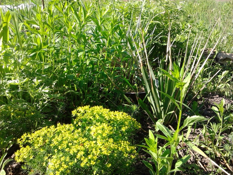 кустик молочая принесла из лесу. Он разросся. Поняла, что придётся за ним следить и сдерживать. Справа отсаженная юкка (цвела в том году), в арьергарде - куст Золотарника канадского.