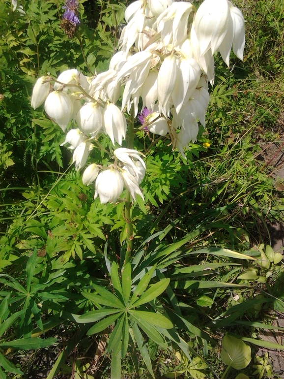 кустик молочая принесла из лесу. Он разросся. Поняла, что придётся за ним следить и сдерживать. Справа отсаженная юкка (цвела в том году), в арьергарде - куст Золотарника канадского.