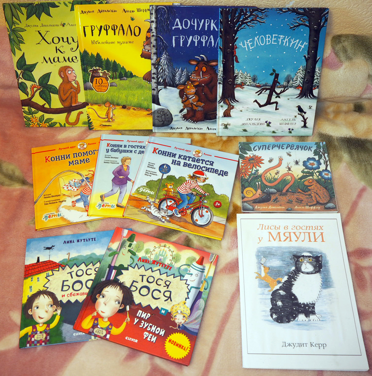 Резко проснулась любовь к книгам Дональдсон. Кристина долго боялась Груффало, не хотела читать. Но потом я включила аудио, и дней 10 только их и слушали. У нас не все есть, кое-что на очереди к печати.