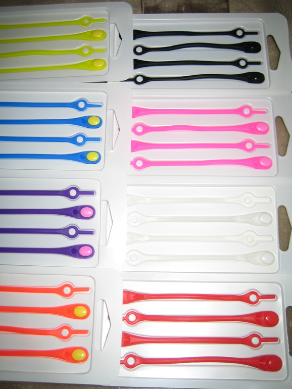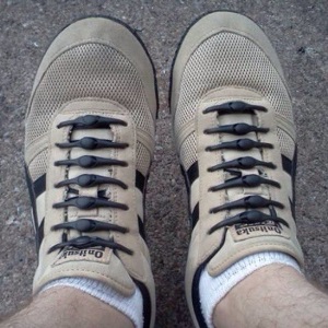 Вместо привычных двух лент вы получаете набор из четырнадцати силиконовых колец. Каждое кольцо продевается через две дырочки напротив и закрывается на защелку. Шнурки можно не развязывать, надевая ботинки - они сами растягиваются. Надел и пошел, в общем.
