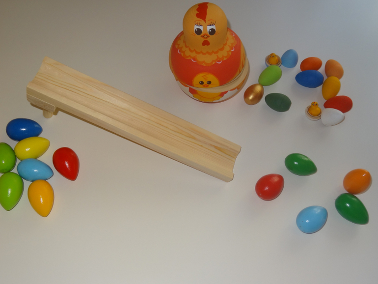 "Пасхальная горка " изготовлена из натурального дерева, все углы и края горки тщательно отшлифованы. а яички раскрашены вручную нетоксичными красками. Играть в такую игру одно удовольствие".