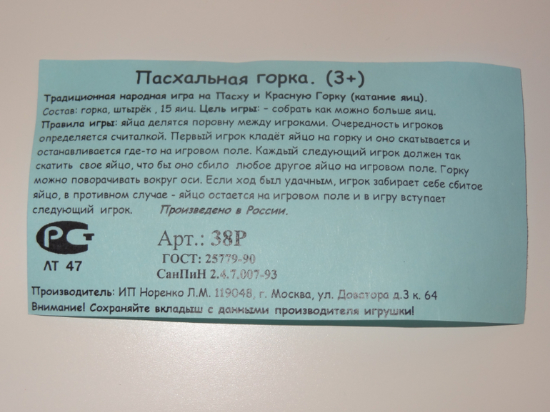 "В состав набора входит : горка неокрашенная (длина 30 см!), штырёк-подставка (высота 9 см), яйца расписные разного цвета (высота 5 см) - 15 штук, правила игры.