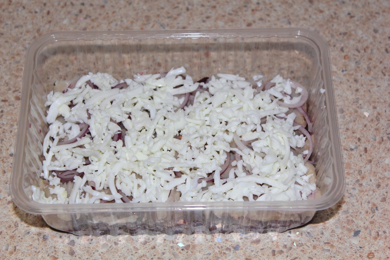 Грядку полить растительным маслом, посыпать тертым яичным желтком. Как вариант можно заменить растительное масло майонезом, промазывая каждый слой