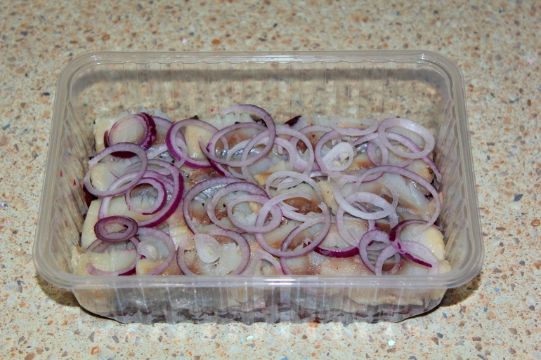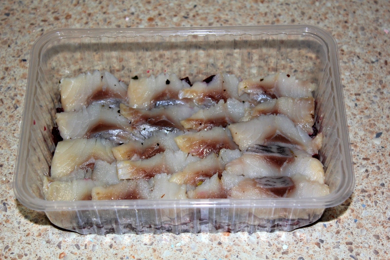 Сельдь порезать тонкими пластиками, выложить на слой свеклы