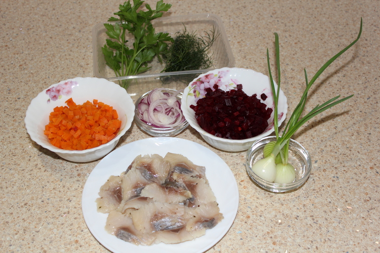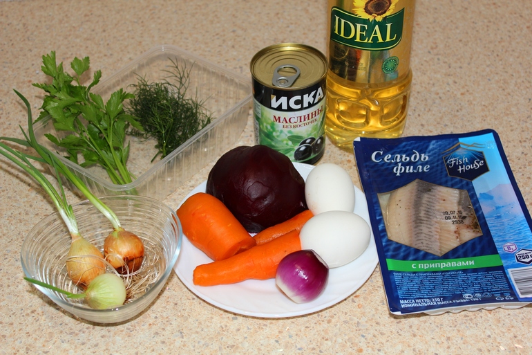 Свекла, морковь, лук репчатый, яйца, сельдь, маслины, растительное масло, петрушка, укроп, проросшие маленькие луковички (лучше если это будет севок)