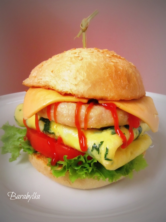 Гамбургер с омлетом и куриной котлетой