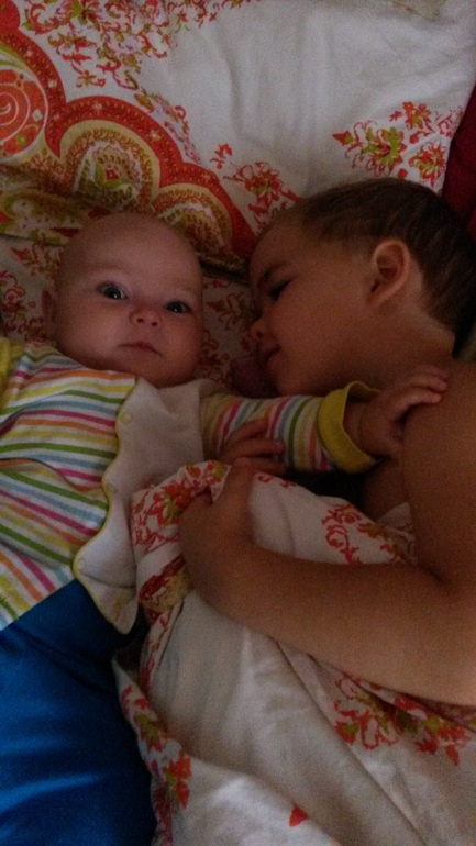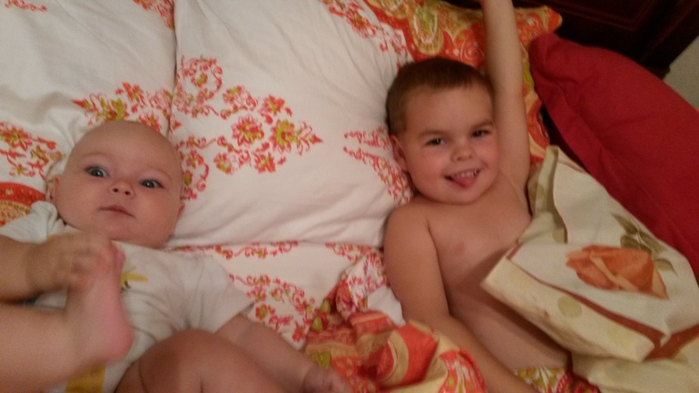 Проснувшись, Марик зовет нас "поваляться". И тут они валяются на славу. Надо видеть, как Милаша прикрывает глазки от удовольствия, когда брат ее обнимает))
