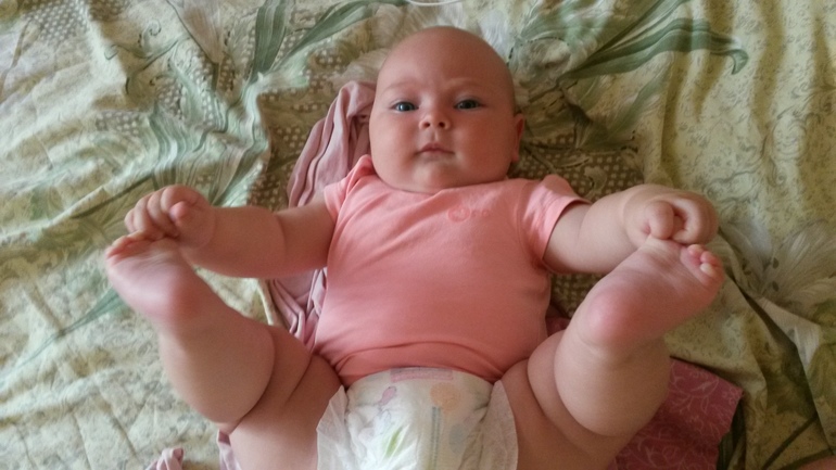 * со вчерашнего дня самая привычная поза бодрствования - лежать на спинке, крепко зацепившись ручками за пальчики ног. Так мило)