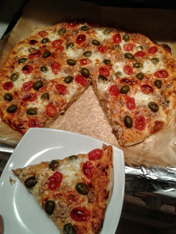 Тесто руками на бумаге расправляем. Соус из помидорок, сыр (да, прямо на соусе), тунец, оливки, черри (лучше без них), моцареллка. Минут 20 при 250.