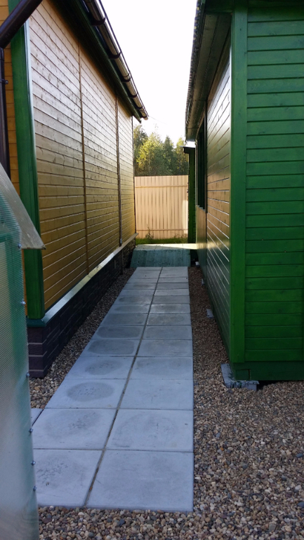 За домом мы построили сарай с верандой и покрасили в цвет дома, плиткой решили сделать только дорожки, а остальное пространство засыпать гравием. Квадратная дыра это задел для будущей клумбы.