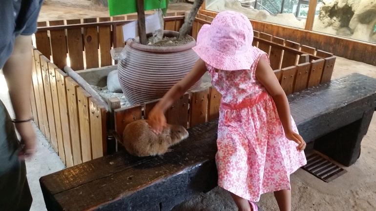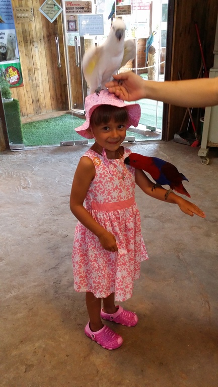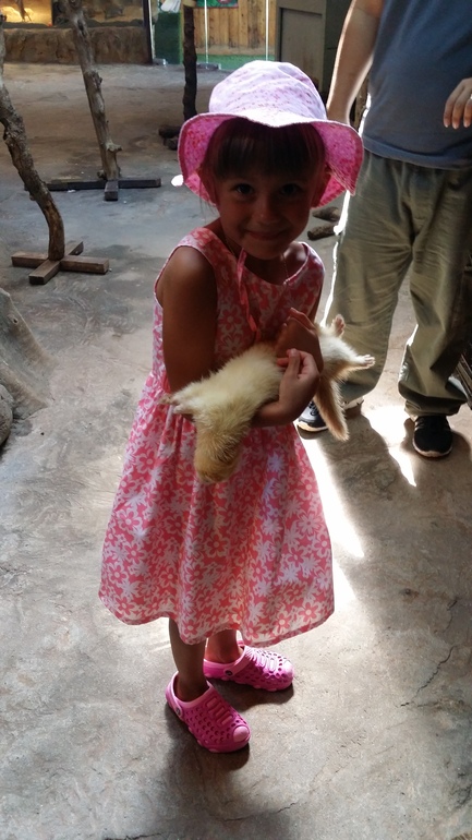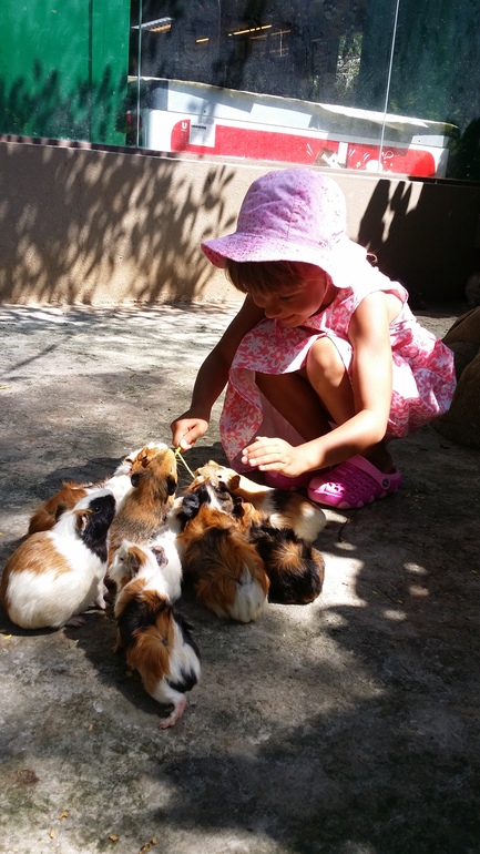 Зоопарк контактный, еду для зверей дают бесплатно. В каждом загоне, боксе - индивидуальный смотритель ласково и нежно берет ребенка за ручку, чтобы не напугать и ведет знакомится с животными. А вот попугаи наплевали на корм и с милиной ручки перелетели ко мне на шляпу, ибо соломку уважают)