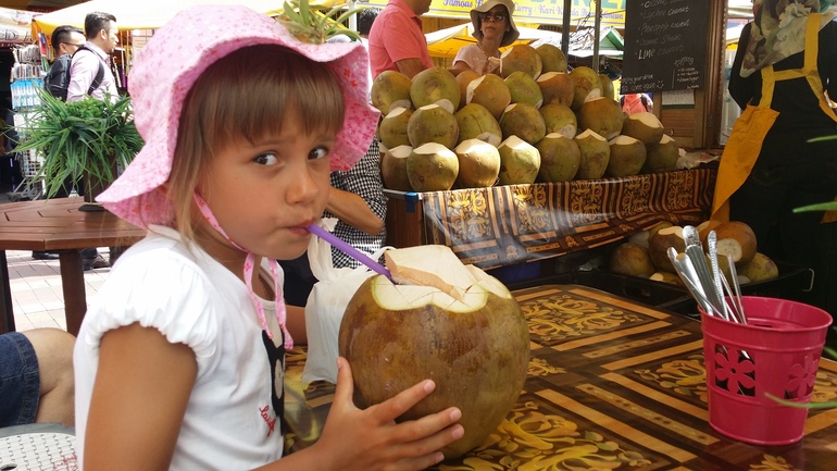Миля пробует малазийские кокосы и приходит к выводу, что тайские слаще)