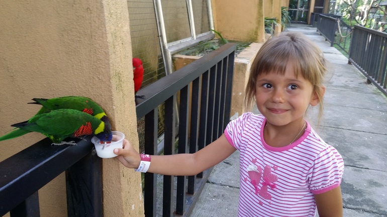 В парке птиц произвело впечатление знакомство с попугайчиками, за 2 рингита служитель наливает мисочку молока и ребенок увлеченно кормит поит разноцветных пташек. Пташки ругаются, двигают друг друга по пути к заветной миске, дают себя погладить) Ребенок в экстазе)