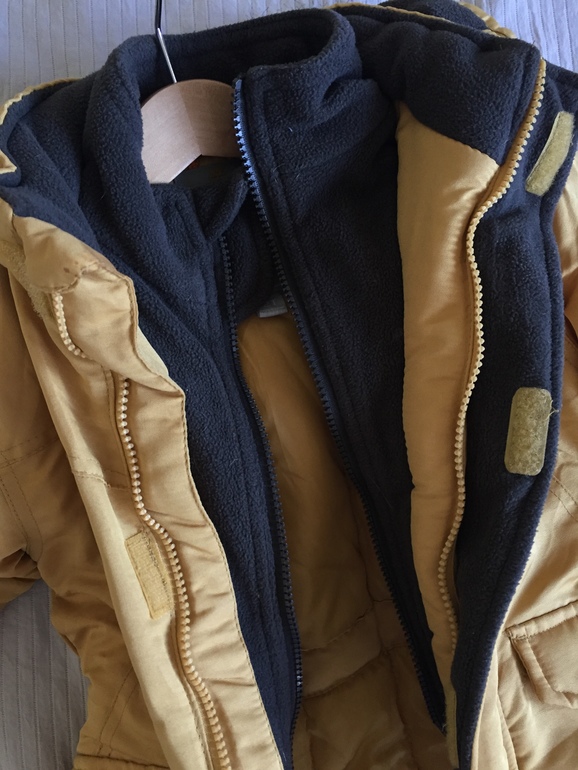 Горчичного цвета, утеплитель синтепон, рукава на внутренней резинке,внутри флисовый воротник на молнии, больше подойдет на худенького мальчика. размер 2Т (большемерит)