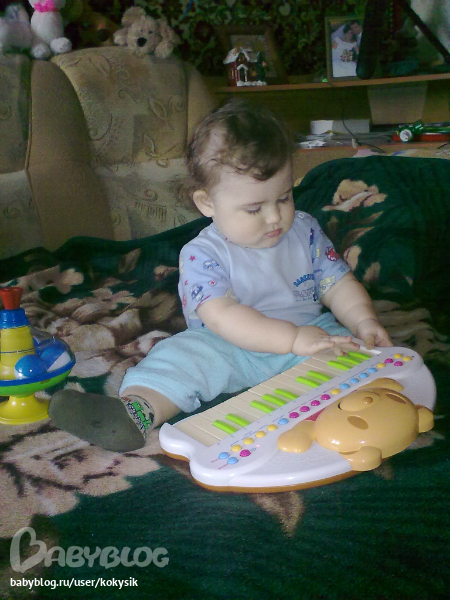 В общем надарили кучу подарков: велосипед, машинку (на которой оталкиваться ногами нужно), юлу, пианино, куртку ветровку, машинка с шариками, кубик развивающий (он нам уже ни к чему), штучку для слепков ручек-ножек и вертолет с палочкой (его катить нужно).