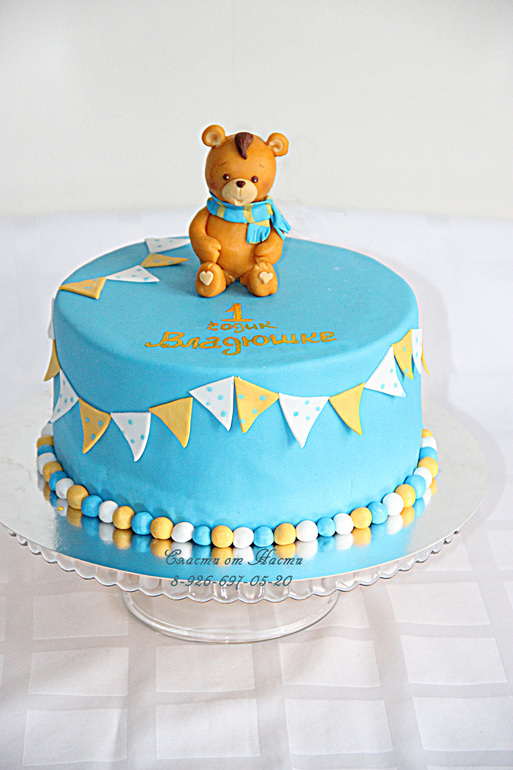 Это был один из тех тортиков, за который я не очень хотела браться,идеи никакой не было, были заданны только цвета синий,белый и желтый, я боялась неправильно подобрать оттенки, оформление рождалось на ходу, когда уже был обтянут торт..Но результат получился ничего так ....))) Думаю шарики были лишними, надо на что то заменить их здесь.....