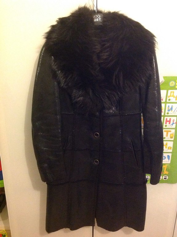 Дубленка черная, размер 46. покрытие: обработка лазером, мех енота, внутри стриженая,длина по спинке-100см, ширина плечь-40,5см, длина рукава 64,5см. Покупала в магазине "Vito Ponti". В очень хорошем состоянии. В придачу отдаю комплект берет + шарф. Мех очень пышный, расправится.