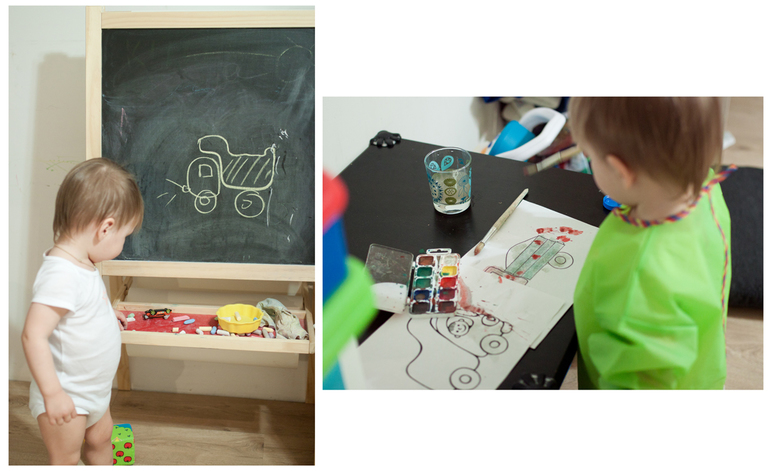 Очень нам нравится рисовать, поэтому сегодня мы раскрашивали грузовики и рисовали их на мольберте