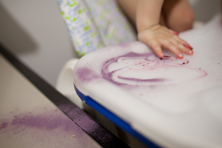 Не скажу что нас впечатлило, но зато очень понравилось ложечкой перекладывать в стаканчики, просто пересыпать и смотреть как крупинки падают. А так же подметать манку кулинарной кисточкой, в этих целях, я даже нарисовала на пласиковом подносе квадрат, куда мы с переменным успехом все сгребали. Еще попробовала подсветить поднос с манкой, но фонарик Кирюшку больше всего заинтересовал.