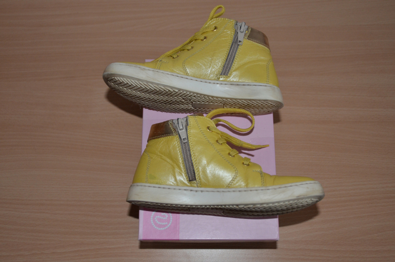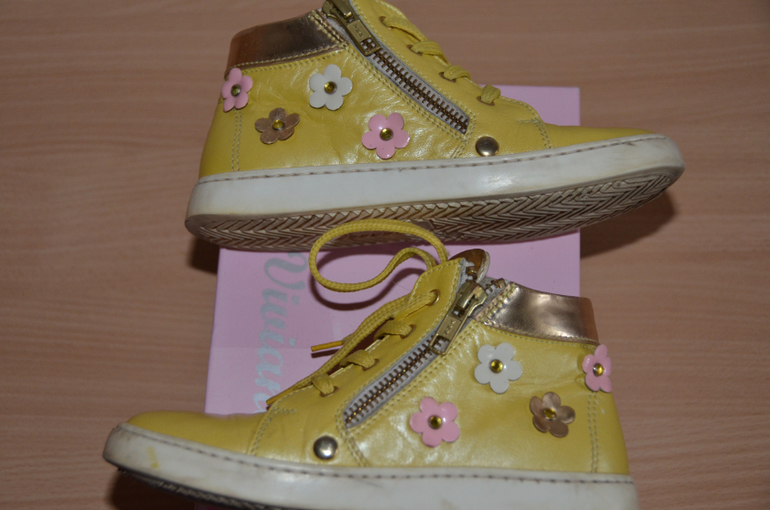 Продам б/у кеды Viviane - кожа на коже, итальянские, все стразы и цветы на месте, два замка и шнуровка, цвет желтый и золотой. Очень красивые, в хорошем состоянии. Нюанс - ободрана пятка.