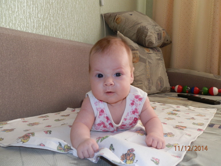 Что умеем - переворачивается на животик, иногда и обратно, держит погремушку, любит разговаривать с сестренкой, всегда ей улыбается, иногда смеется, руки и все что в них попадает тянет в рот (но зубов пока не видно).
