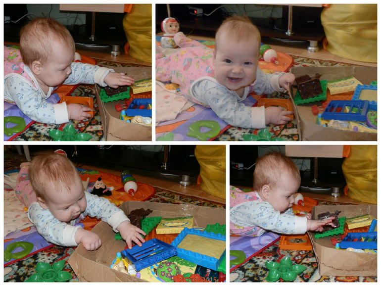 В 7 и 6 Катя села с пола, а в 7 и 12 поползла. Теперь доступны все игрушки)) Столько впечатлений, столько счастья, визжит, поет песни) В речи появились "ма-ма-ма-ма" и "ба-ба-ба")