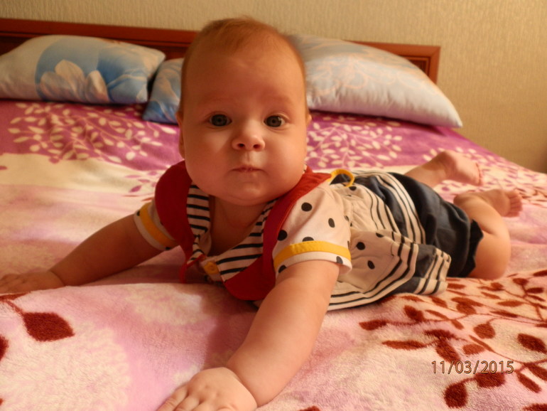 Умеет переворачиваться с живота на спинку, со спины на бок, и так еще бывает голову поворачивает, когда на боку лежит, что еще чуть-чуть и на животик перевернется). "Жует" свои кулачки. Любит лежать на развивающем коврике, рассматривать игрушки, пытается схватить их. Активно разговаривает на своем. С папы глаз не сводит, как только тот появляется в поле зрения))