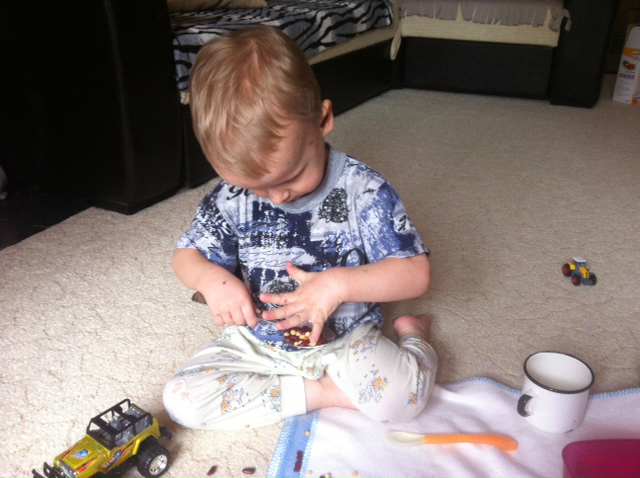 После наступило время обеда. Отобедали мало, т.к. деть до этого кусочничал печенками. Сколько съел, столько съел. Погребли снова в "игровую". Услышав "Кир, давай ложится отдыхать", мелкий снова попросил есть. Накормила еще раз, спать уложила. В 14.30 деть уснул и спал до 16.00. За это время успела переделать кучу дел (с учетом того, что в 15.30 деть захныкал и я до пробуждения лежала рядом). После поиграли, пополдничали. Снова "отработали концертную программу" и позвонили бабушке по скайпу. Часа 1,5 занимали линию.