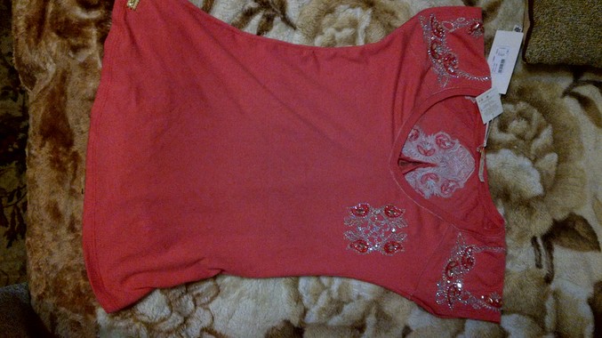Эля, получила свою футболку, мне понравилось, качество хорошее и материал приятный к телу, не синтетика. Но мне кажется они немного маломерят на мои Ог 90 и Об 99, почти обтянула, хотя кто как любит. А вот фото.