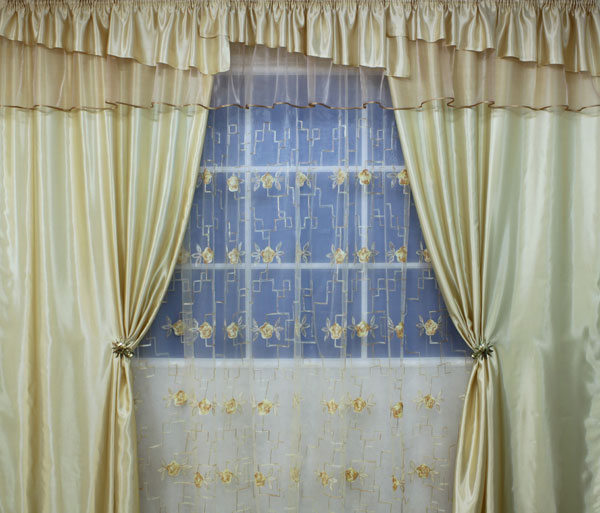 Комплект штор изготавливается из плотного однотонного портьерного атласа с выдавленным рисунком а также ткани "blackout". Ламбрекен из того же материала отшивается шириной 3 метра.