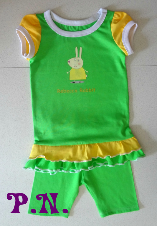 Много летних нарядов не бывает-подумала я и сшила еще один комплект))))В него входят футболка+легинцы+бриджики.Викуля заценила изображение семейки Свинок и счастливая тут же нарядилась на прогулку