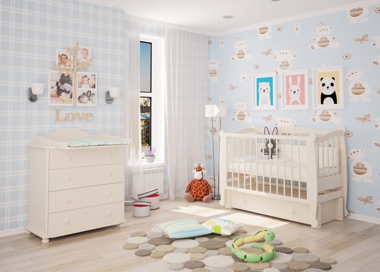 Можно взять кроватку и пеленальник цвета слоновой кости, туда же взять мой любимый комплект с мишками и обои тоже кремовые какие-то.