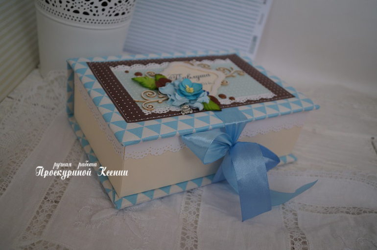 Большая коробка внутри которой находятся коробочки поменьше, в каждой из которой находится символический подарочек, а под ними сертификат в оформленном конверте.
