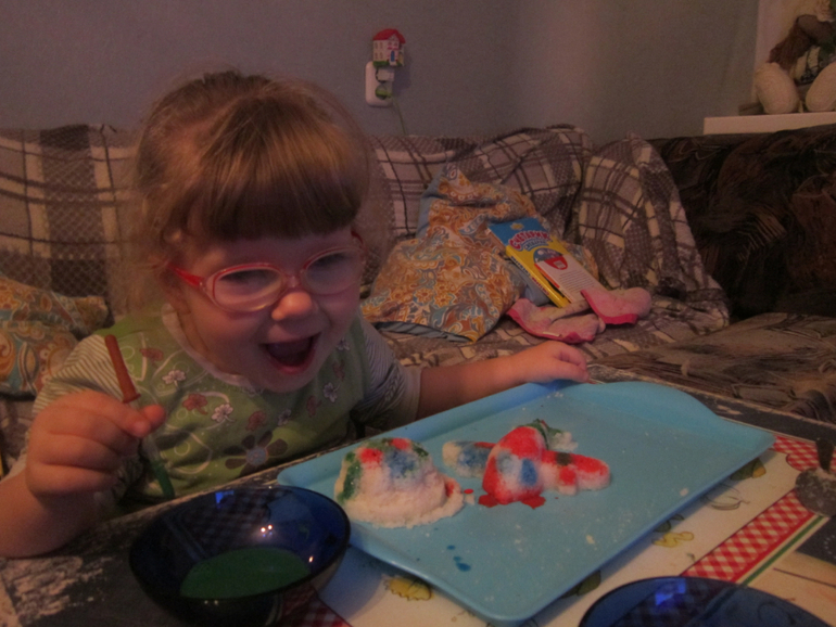 Вот что у нас вышло(соль смешать с водой, сделать из них, с помощью формочек фигурки и раскрасить путём капанья красок пипеткой!!!)