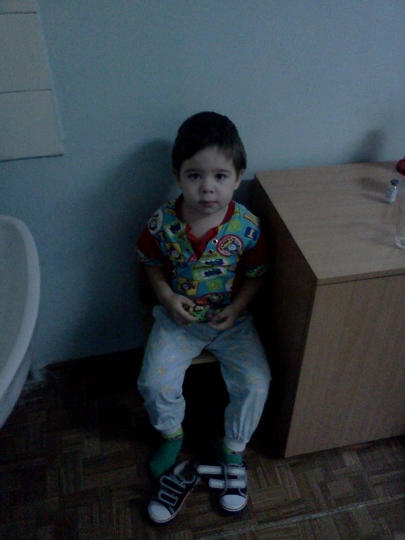 В прошлый вторник, 22 октября, забрала из сада совершенно здорового ребенка. Легли спать как обычно. В полвторого ночи Влад проснулся с резким лающим кашлем, начал хрипеть, задыхаться... Пипец... Я перепугалась, вызвала скорую. Врач сразу спросил - есть ли у вас небулайзер, я говорю - нет, он удивился и спрашивает - это у вас первый раз что ли такое? Ага, говорю, самый-самый первый раз. Ларингоспазм. Собирайтесь, говорит, в стационар поедем. Детеныш мой все это время ревет сильно-сильно, периодически лает как собачка (кашляет то есть). Приехали в стационар, сонная врач медленно-медленно опрашивала меня, посмотрела Владу горло, потом тетечка другая в приемном покое долго-долго заполняла бумажки. Потом я с плохо дышащим ребенком еле забралась на 4 этаж (лифта ессссно нет, нахрена он в больнице?). В отделении наконец-то дали Владюхе подышать через небулайзер пульмикортом с беродуалом, сделали укол дексаметазона, дали полтаблетки супрастина. Сынульке полегчало сразу, задышал нормально. Потом проводили нас в палату, палата на троих, но мы там были одни. Вот фотки с телефона, это мы только вошли в палату, переодеваемся, время - почти 3 часа ночи.