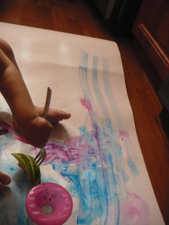 Раскладывали по размеру - по убыванию - кусочки. Здесь у нас не очень получается. Находит самый большой и самый маленький кусок. А потом с моей помощью раскладывает остальные. А вот с матрешками - хорошо получается и ловко. Наверное, из-за того, что там практически можно примерить размеры. Пытались еще собирать разрезную картинку. Тоже не очень идет, пока не понимает.