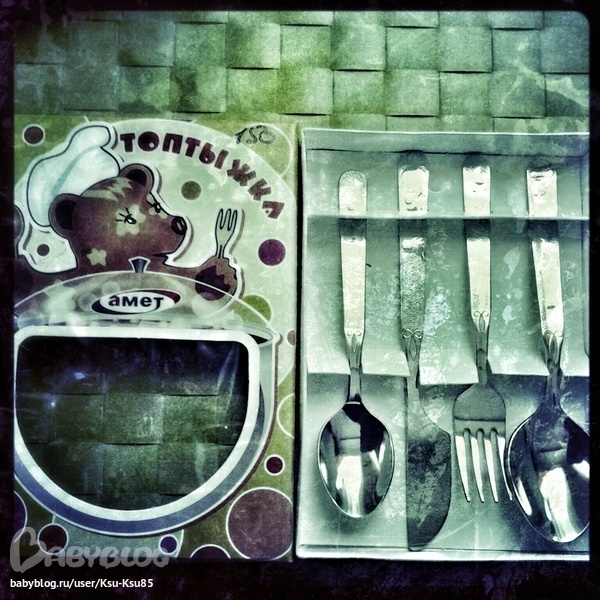 вот такую красоту мы вчера купили.Набор суперский,а стоит всего 150рэ:)взрослой вилкой Гри орудует только в путь,поэтому сейчас освоим маленькую и бу приступать к ножу)))