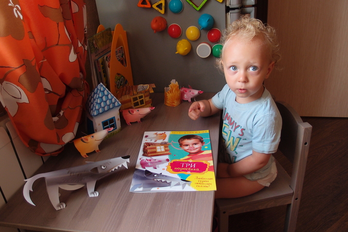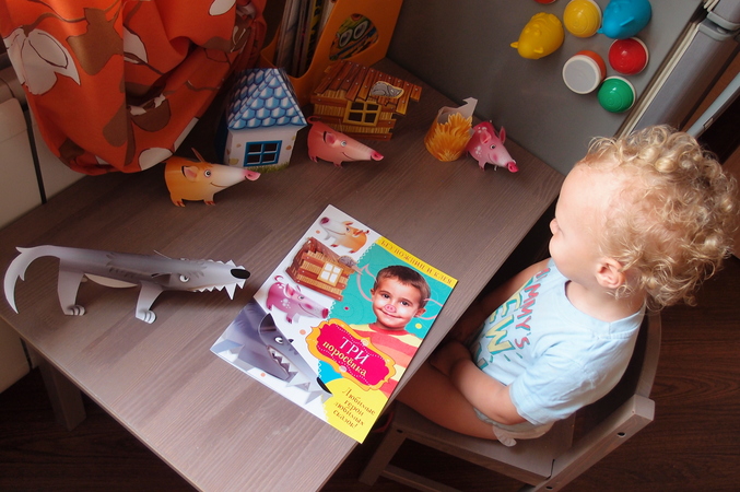 Сказку прочитала,фигурками всё проиграла,Гри счастлив)))Особенно его впечатлил волк,который дул на домики,повторял всё за мной)