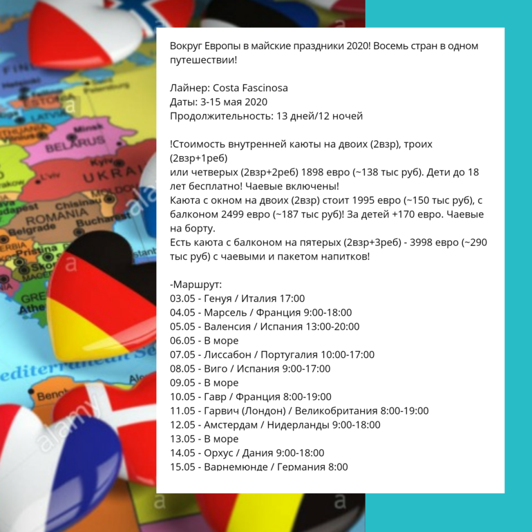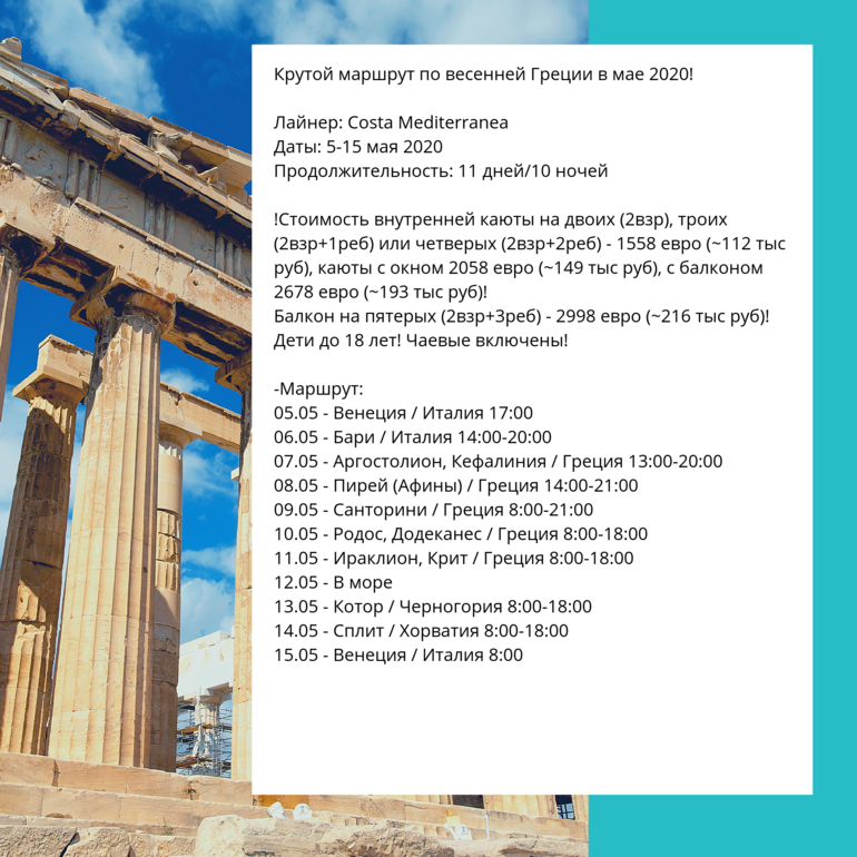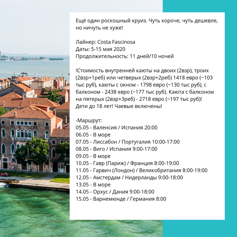 Второй круиз чуть короче и чуть дешевле, без Италии, в остальном не менее прекрасен!