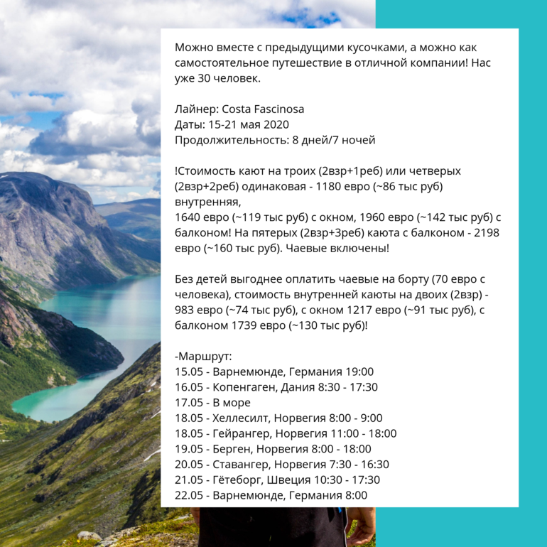 Если добавить к любому из этих двух кусочком недельный круиз по фьордам в моей компании, то это будет просто вишенка на торте!