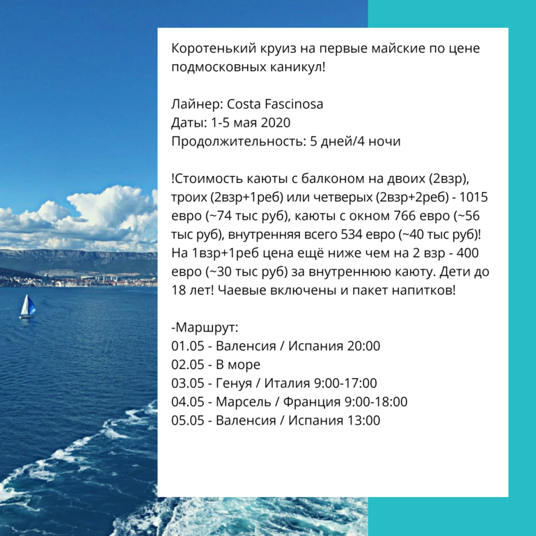 А мы с вами этого не хотим. Поэтому просто выбирайте СВОЙ крутой круиз на май 2020 года и наслаждайтесь подготовкой! Обратите внимание на пятиместные каюты, они есть и я за ними пристально слежу, т.к. многодетных среди вас всё больше ????
