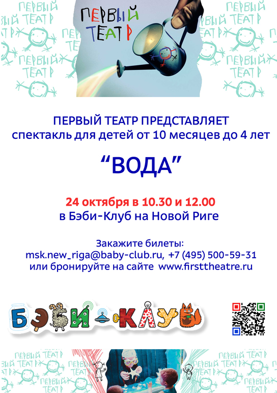 В специально организованном комфортном пространстве, которое не разделено на зрительный зал и сцену, дети с родителями смотрят и участвуют в действе, главным героем которого является вода и все, что с ней связано. В спектакле используются куклы, природные материалы, мультимедиа, оптические эффекты. Постановки Первого театра не похожи на традиционные спектакли. Это новый, контактный, интерактивный и развивающий театр для маленьких детей, построенный на опыте европейских бэби-театров, детских психологов.