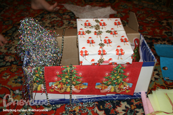 А вот эту вот коробочку мы положили под ёлочку, что там не знаем, будем ждать НГ и откроем её в новогоднюю ночь!