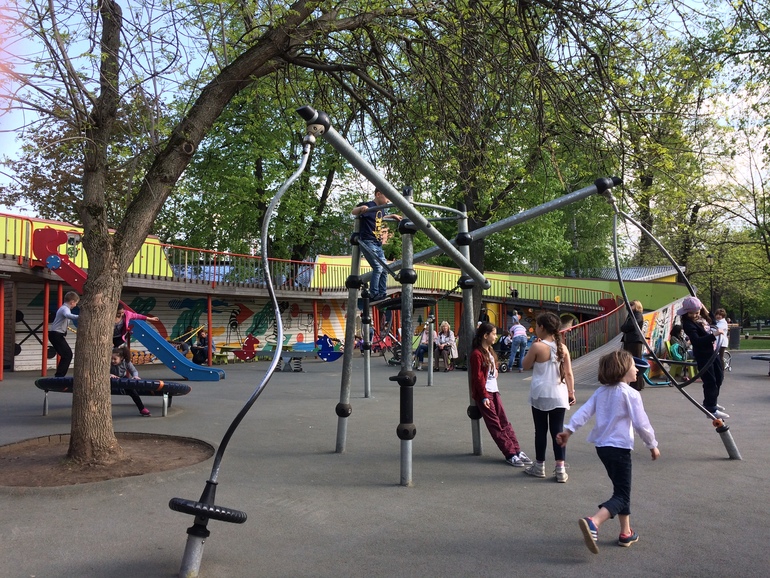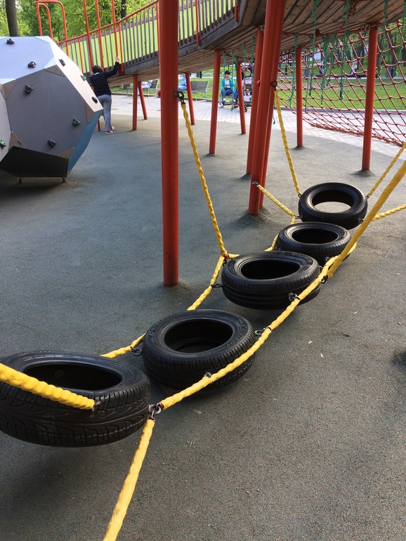 Родной и любимый Таганский парк немного надоел, поэтому пытаемся выехать подальше. Недавно посетили площадку в саду Баумана. Она входит в список лучших детских площадок Москвы, о которых я писала здесь.. Действительно очень крутая площадка. Если приглядеться, виден второй уровень из досок. По нему детки бегают и катаются на самокате.
