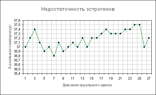 В первой фазе цикла в женском организме доминирует гормон эстроген. Под влиянием этого гормона базальная температура до овуляции держится в среднем в пределах от 36,2 до 36,5 градусов. Если температура в первой фазе поднимается и держится выше этой отметки, то можно предположить недостаточность эстрогенов. В этом случае средняя температура первой фазы поднимается до 36,5 - 36,8 градусов и удерживается на этом уровне. Для повышения уровня эстрогенов гинекологи-эндокринологи назначат гормональные препараты.