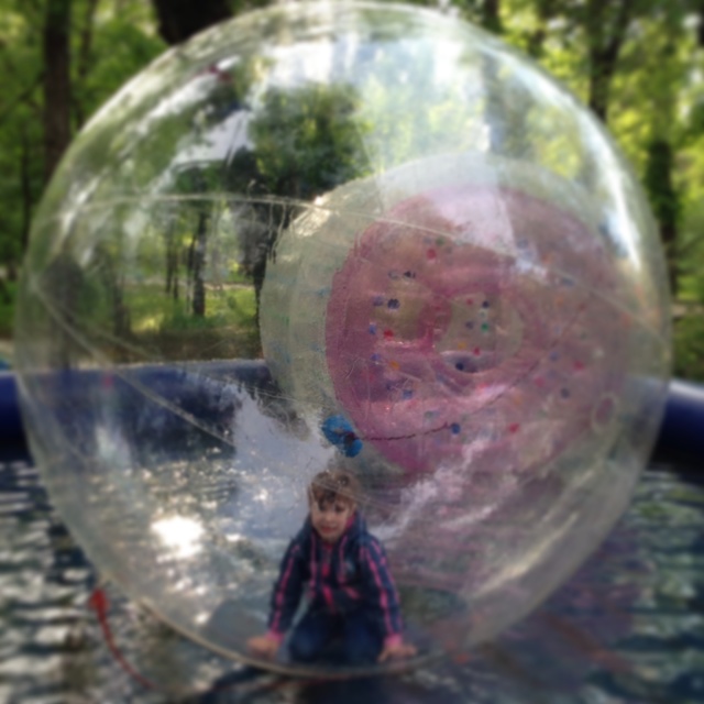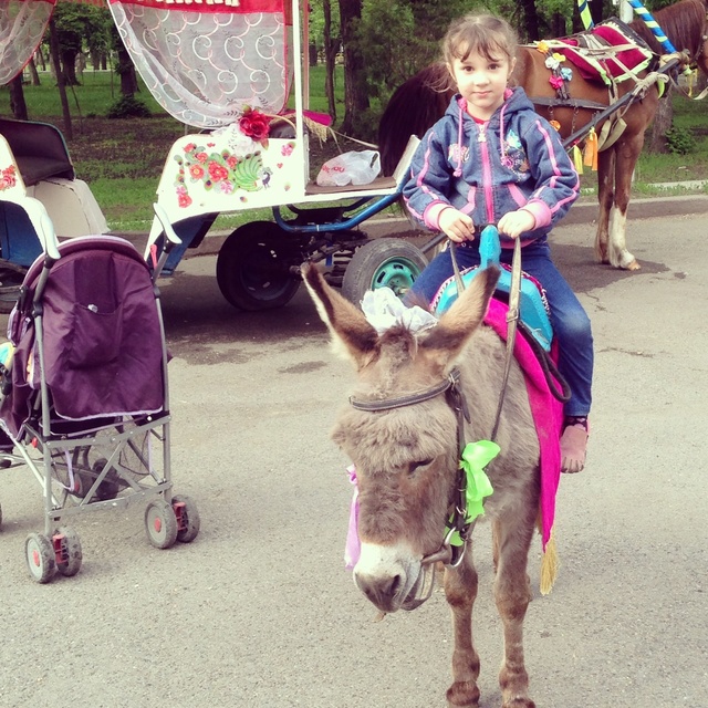 Потом она залезла в шар на воде. Долго не стала. Холодно говорит. Вовка на ксрусели опять. В итоге прокатилась на ослике и на карете так сказать. Сидела впереди и помогала лошадью управлять.