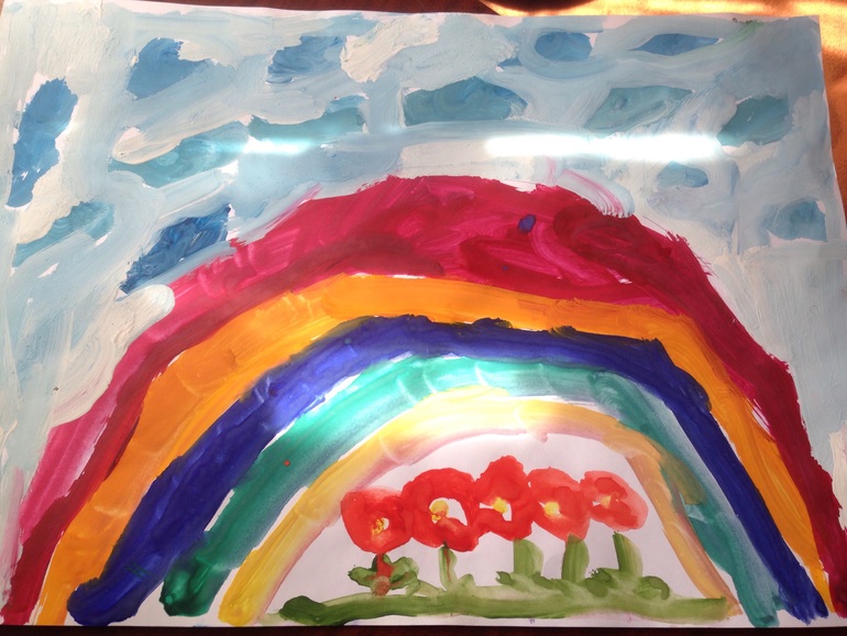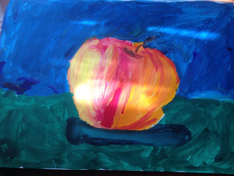 На первом они нарисовали яблоко и облока с радугой и цветами. На втором грушу и арбуз. Рисуют гуашью. После первого Ника отказалась ходить. Ей не разрашили рисовать то что она хотела. Поговорила с ней. Вроде убедила. А после второго она ждет не дождется следующего занятия.