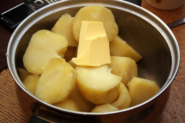 Картофель нужно очистить и сварить до мягкости в подсоленной воде. Когда он будет готов, воду нужно слить и добавить к нему хороший кусочек сливочного масла.